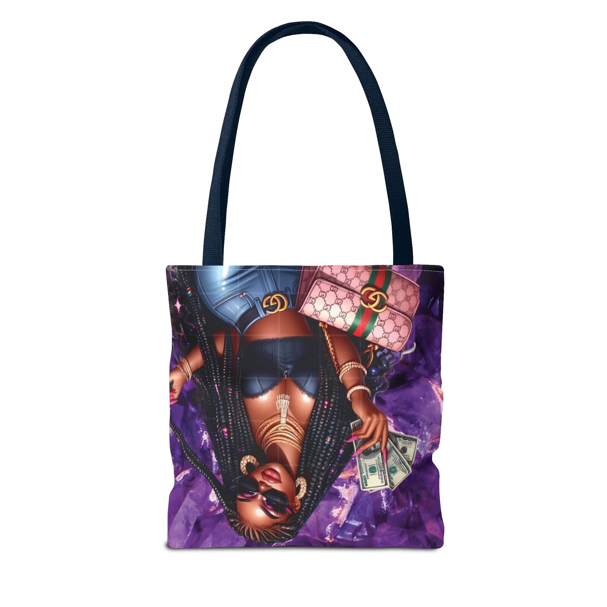 This boldly printed tote brings attitude and everyday utility together. A luxe, street-style illustration wraps the bag in deep purples and jewel tones — a confident woman with shades, stacks of cash, and designer touches sets a fierce tone. The roomy boxed design and reinforced handles carry groceries, gym gear, or a laptop with ease. Carry it to markets, late-night runs, or city outings to add a splash of personality to your routine. The durable polyester build and neat internal laminate mean the colors stay vibrant and the shape holds up to daily wear.